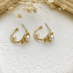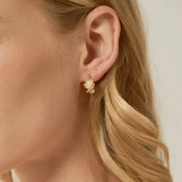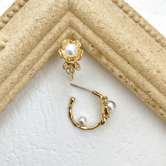 Minimalist Pearl Huggie Earrings, Freshwater Pearl Earrings, and Gold Flower Pearl Hoop Earrings.
